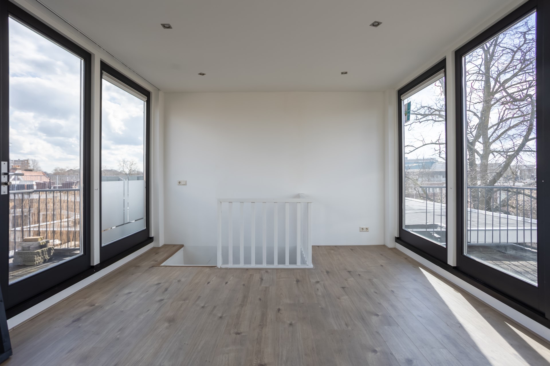 Via de trap bereik je vervolgens de prachtige lichte ruimte op de derde etage, die is voorzien van spot verlichting in het plafond en aan weerszijden toegang biedt tot een terras. Deze ruimte is perfect te gebruiken als werkruimte aan huis of als (extra) slaapkamer.