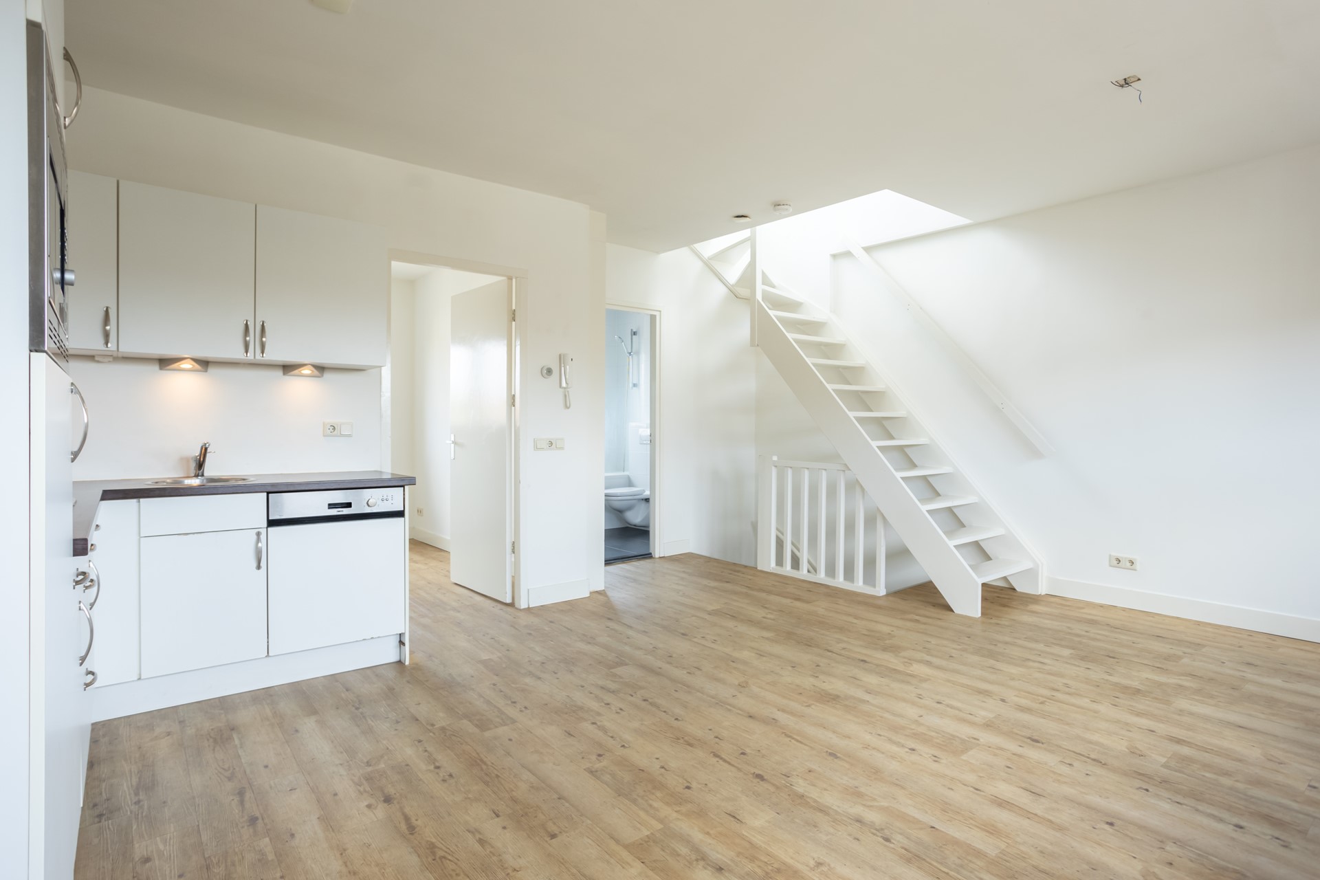 Via de begane grond bereik je de hal die via de trap toegang biedt tot de eerste etage, waar de eigen voordeur van het appartement is te vinden. Via de trap op deze etage bereik je de woonkamer van het appartement, die plek biedt voor een bank en eethoek. Tevens bevindt zich hier de open keuken die van alle moderne gemakken is voorzien, zoals koelkast met vriesvak, vaatwasser, combi-magnetron, 4-pits gasfornuis en afzuigkap. Op deze etage is tevens de (eerste) slaapkamer te vinden, die zich bevindt aan de achterzijde van het pand. Ook tref je op deze etage de badkamer die is voorzien van badkamermeubel met verlichting, bad/douche en wasmachine aansluiting.