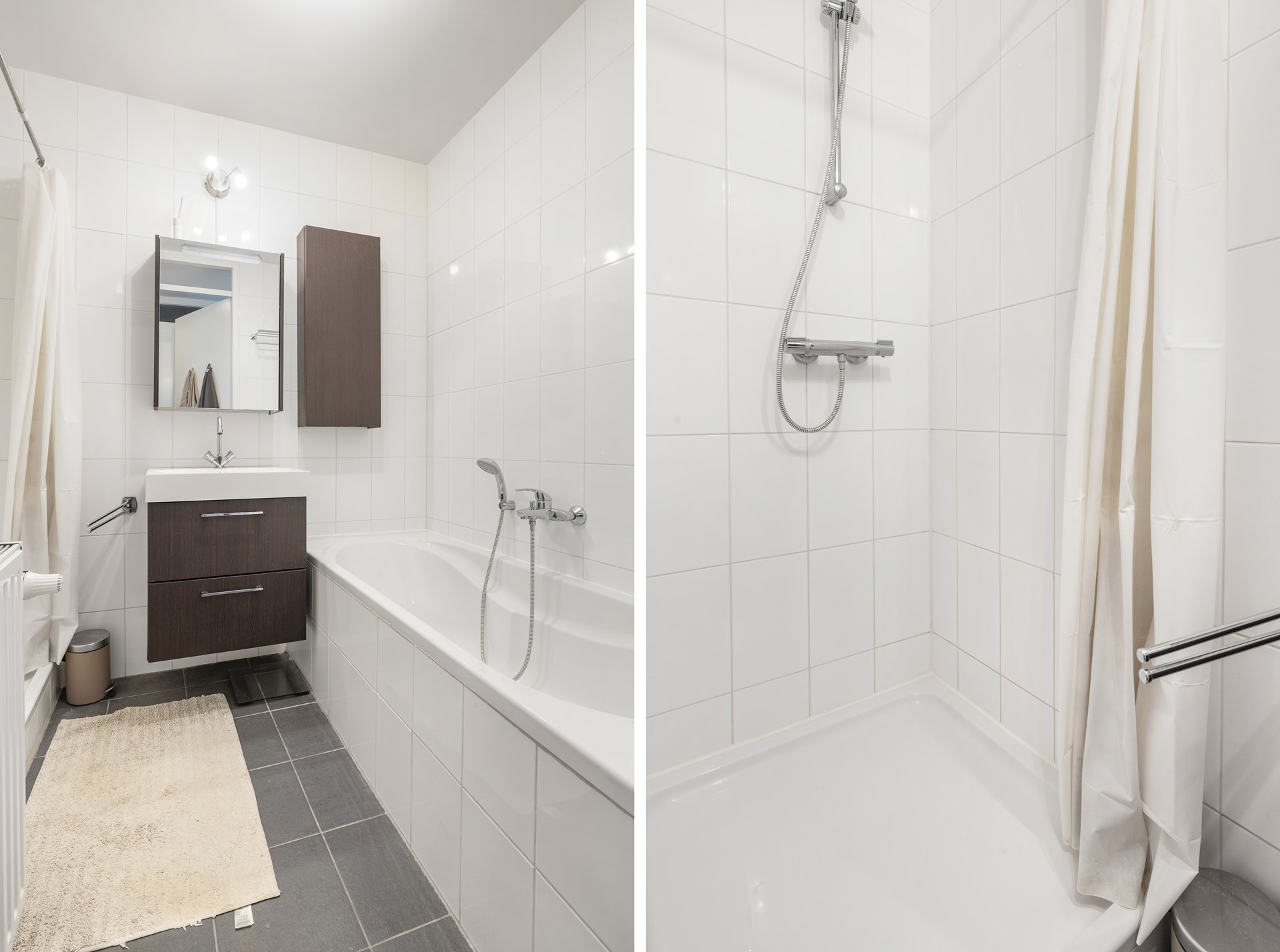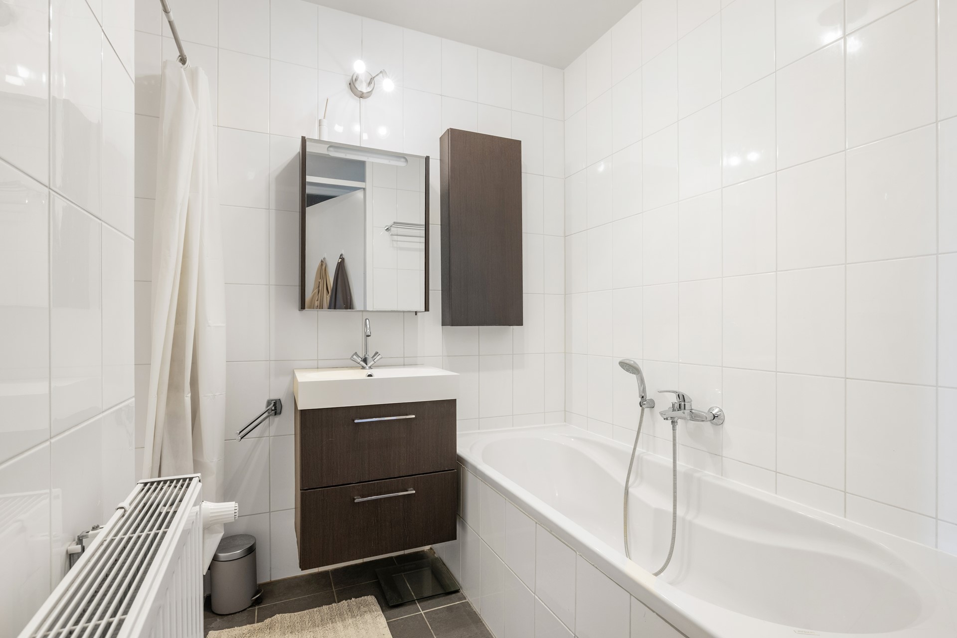 Centraal in de hal bevindt zich de badkamer, welke is uitgerust met een ruime douche, ligbad en wastafel met modern badkamermeubel. Daarnaast is er een separaat toilet aanwezig. Ook is er een praktische inpandige berging met wasmachineaansluiting.