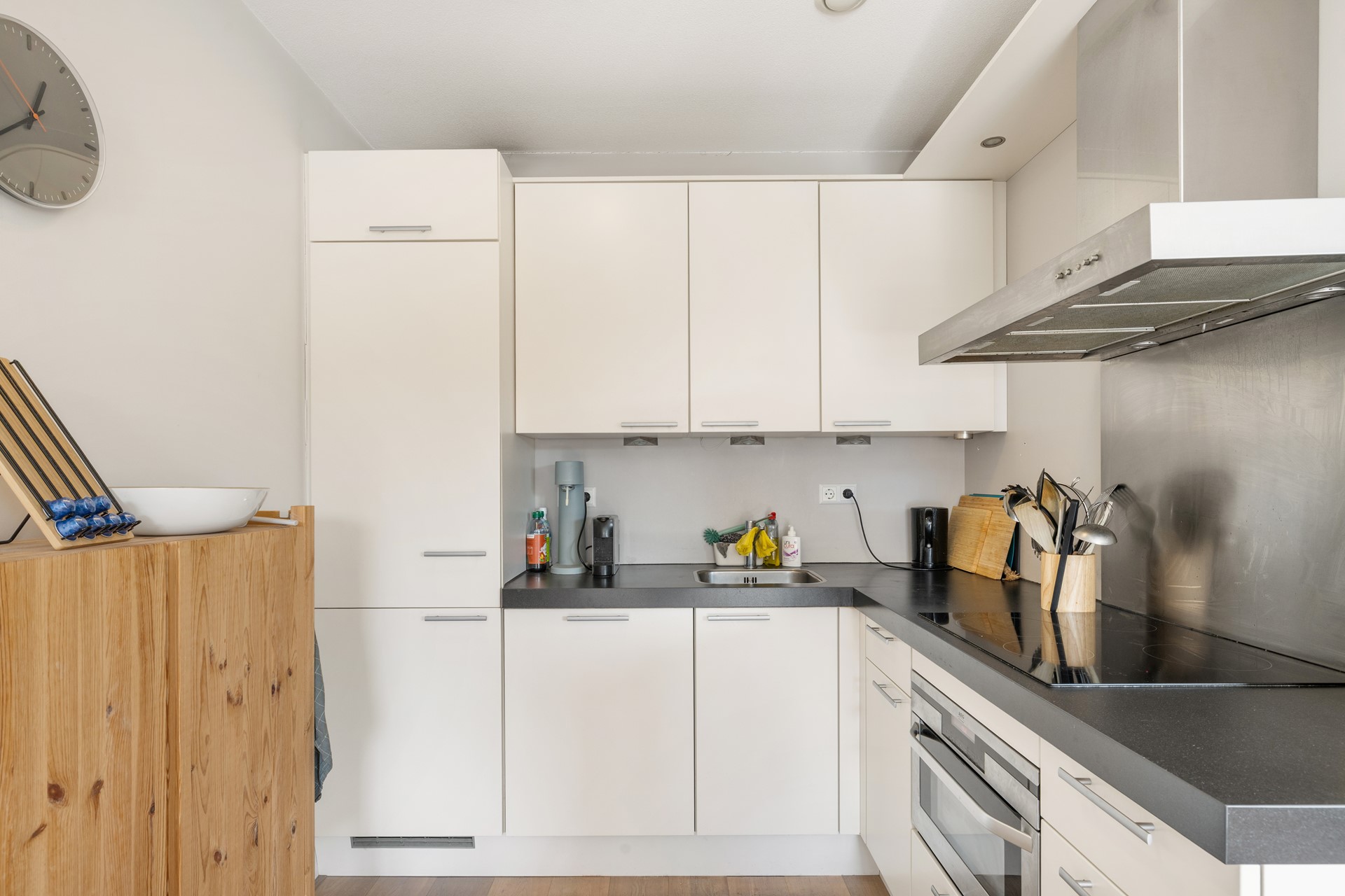 De open keuken is modern uitgevoerd en voorzien van diverse inbouwapparatuur, waaronder een 4-pits inductiekookplaat met oven, afzuigkap, koel-vriescombinatie, vaatwasser en combimagnetron.